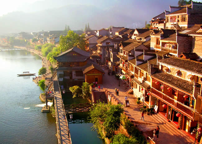 湖南鳳凰古城始建于清康熙四十三年〔1704年〕,歷經(jīng)300多年的風雨滄桑,古貌猶存,F(xiàn)東門和北門古城樓尚在。城內(nèi)青石板街道,江邊木結(jié)構(gòu)吊腳樓,以及朝陽宮、古城博物館、楊家祠堂、沈從文故居、熊希齡故居、天王廟、大成殿、萬壽宮等建筑,無不具古城特色。古城以古街為中軸,連接無數(shù)小巷,溝通全城。古街是一條縱向隨勢成線、橫向交錯鋪砌的青石板路,自古以來便是熱鬧的集市,如今更加生機勃勃。鳳凰古城的標志性建筑之一虹橋,原名臥虹橋,歷史悠久。鳳凰古城北門城樓本名“碧輝門”,采用紅砂條石筑砌,既有軍事防御作用,又有城市防洪功能,是古城一道堅固的屏障。鳳凰古街兩邊建筑飛檐斗拱,店鋪中陳設著琳瑯滿目的民族工藝品,濃濃的古意古韻,透出古街深厚的民族文化底蘊。