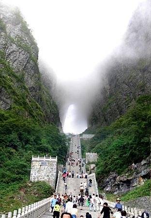 選擇乘索道游覽天門山是最佳視角。索道吊廂一出站房,馬上就騰空飛了起來,從城市的一棟棟樓頂掠過,猶如在城市上空滑翔。翻過一道山梁之后,城市被遠遠拋在了視線以外,大片翠綠的稻田映入眼簾,透過打開的通風窗口,一陣陣青草水田特有的清香沁入心脾。或高或低的農(nóng)舍不時從我們身下滑過,牛羊們?nèi)齼蓛捎崎e的在田間浮動著,靜謐、安詳。再翻過一座山峰,我們便立即被滿山的青翠所包圍,萬仞絕壁也已投懷送抱。索道支架矗立于絕壁天險中,或挺立或傾倒或探頭或擁抱,我們繼續(xù)在艱險中游歷,時而隱沒于云堆,時而出世于蒼穹。這時你除了那滿懷的驚險刺激外有的便只有望索而興嘆了。我拍了很多片子,但是總覺得還是沒有足以記錄下來這座空中盆景的壯麗。