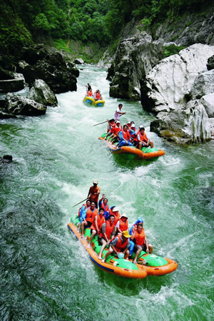 猛洞河水量豐富,河流坡降大,水急灘多浪奇,高大的峭壁直插水面,兩岸并相靠攏,形成幽深的峽谷景觀。沿河兩岸古木蒼天,蒼翠欲滴,奇石錯落,流泉飛瀑隨處可見,下游一路水碧山青,風光秀麗,野猴成群,溶洞奇特。猛洞河天下第一漂項目位于猛洞河支流,全長47公里,最精彩處位于哈妮宮至牛路河段,長約17公里。該景區(qū)兩岸多為原始次森林,蔥蔥郁郁,水流湍急,碧綠清亮,有十里絕壁,十里瀑泉,十里畫卷,十里洞天的美譽。其中有急流險灘108處,大小瀑布20處。漂流,穿急流,越險灘,闖狹谷,捕激浪,有驚無險,回味無窮。特別是哈妮宮、三角巖、雞籠門、遇仙峽(捏土)、閻王灘、落水坑、夢思峽、鯉魚剖肚、三大炮等景點,無不令人叫絕觀止。