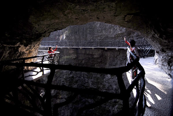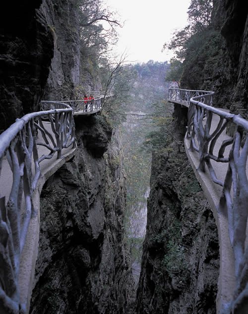 據(jù)施工人員介紹,此條棧道也是他們所修棧道中施工最難,最險峻的一條。如果您還覺得不夠刺激的話,在棧道的完結(jié)處的兩個懸崖之間有一條長160米的懸索吊橋,同時,在海拔最高點(diǎn)還有一個挑戰(zhàn)心里極限的玻璃站臺,在這里,如果你能挺直腰板伸開雙臂,那么,您就是真正的勇士了。