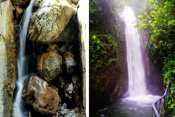 西線(xiàn)原名叫雪花溪,又叫雪花洞,水從懸崖上掉下來(lái)濺起水花,泉水與巖石相碰,落成大霧,形成雪花狀,故名雪花溪。因地勢(shì)險(xiǎn)峻,歷代人都沒(méi)有把雪花溪走通過(guò),從下往上看深不見(jiàn)底,古人以為是一個(gè)洞,故又叫雪花洞,其實(shí)是一個(gè)峽谷,有七潭七瀑,現(xiàn)在叫“仙女峽谷”。峽谷長(zhǎng)800米,最窄處僅1米左右,上下落差近200米,因水的長(zhǎng)期回旋沖刷, 巖層的堅(jiān)硬度各異,形成了底寬頂窄,時(shí)北,時(shí)西,時(shí)東,陰暗無(wú)光,形似溶洞, 泉水飛流直下,形成梯級(jí)瀑布,擊打在巖壁上濺起的水花猶如雪花飛舞,潭中一片雪白,古人稱(chēng)之為雪花洞,峽谷中有七個(gè)各異的潭池在沖擊的水花中若隱若現(xiàn),故改稱(chēng)為七仙女人間沐浴瑤池,從開(kāi)天辟地起無(wú)人行通過(guò),現(xiàn)在已修好的占道,于峽谷水花之中,幻入仙境之感。