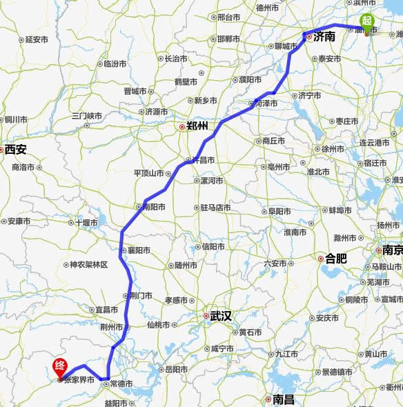左右,沿途經過青州——淄博——濟南——平陰縣——菏澤市——蘭考縣——許昌市——平頂山——南陽——襄陽——荊門——荊州——常德(也可以走國道經澧縣、石門縣)——慈利——張家界。