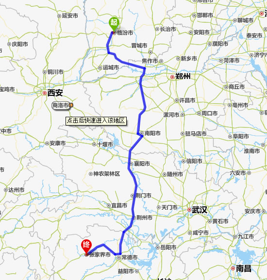 左右,沿途經過臨汾——濟源——南陽——襄陽——荊門——荊州——常德(也可以走國道經澧縣、石門縣)——慈利——張家界。