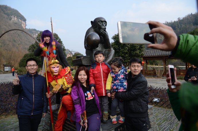 手持金箍棒,頭戴紫金冠。2月2日,農(nóng)歷臘月二十四,中國傳統(tǒng)小年節(jié)氣。當(dāng)天下午,旅游勝地張家界武陵源黃龍洞景區(qū),一名“美猴王”打扮的特殊游客現(xiàn)身“后天”雕塑、龍宮大廳、花果山等景點(diǎn),其惟妙惟肖的“孫悟空”動(dòng)作表演,不時(shí)引來其他游客的驚呼:大圣歸來!