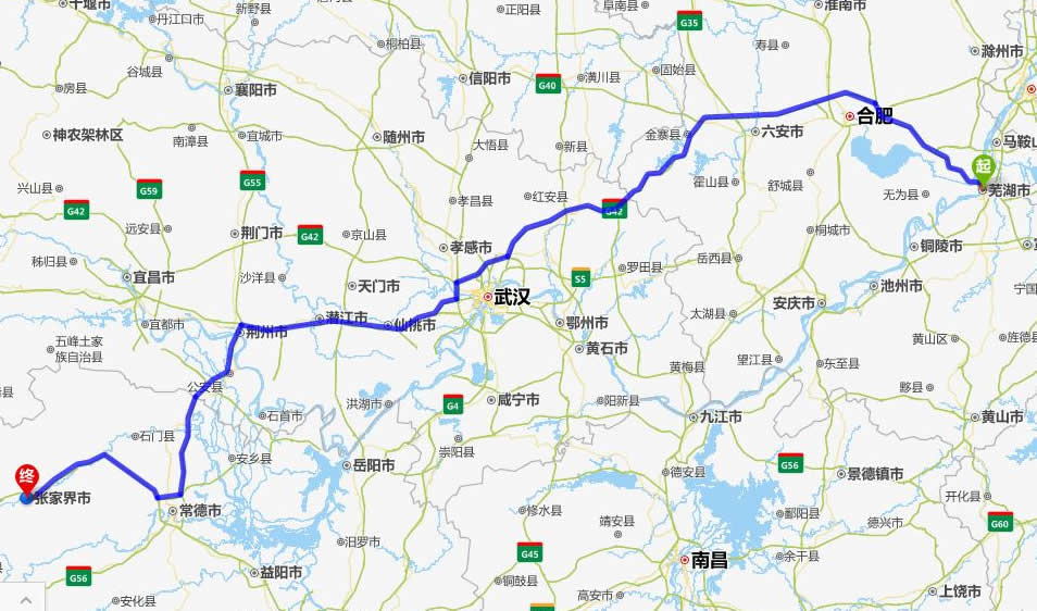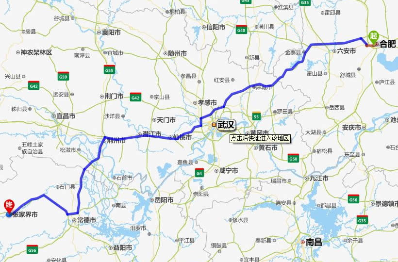 左右,沿途經過蕪湖——合肥——六安——金寨縣——麻城市——漢川市——仙桃市——潛江市——荊州市——公安縣——澧縣——常德(也可以走國道經澧縣、石門縣)——慈利——張家界。