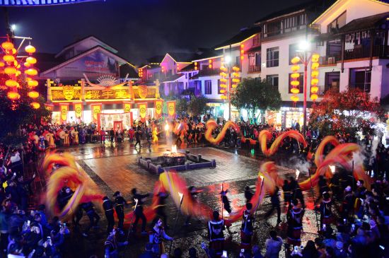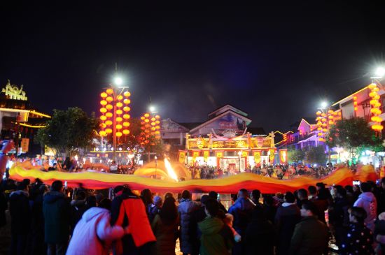 火龍出場(chǎng),街區(qū)狂舞;盤(pán)龍點(diǎn)睛,眾人祈福。12月21日,農(nóng)歷冬至,當(dāng)天夜晚在旅游勝地張家界武陵源區(qū)溪布老街?jǐn)[手堂廣場(chǎng)啟動(dòng)的 “武陵腔調(diào):趕火趕戲趕大年”活動(dòng)儀式上,一條全身似火的長(zhǎng)龍?jiān)诮倜良覂号奈鑴?dòng)下 “閃亮”登場(chǎng),格外耀眼。據(jù)了解,這條長(zhǎng)龍身有香味,全長(zhǎng)108米,是目前世界最長(zhǎng)的香火龍。